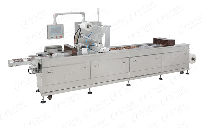 休閑食品真空包裝機是利用可拉伸和熱塑的薄膜或片材作為原料來制造容器,在裝填物料后再以薄膜或片材覆蓋進行抽真空和氣調密封的包裝設備。